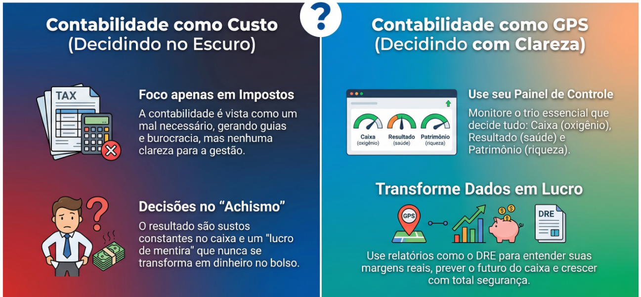 Quando você entende que a contabilidade é uma ferramenta de inteligência, você para de olhar para o retrovisor (o que já passou) e começa a olhar para o para-brisa (para onde a empresa vai).